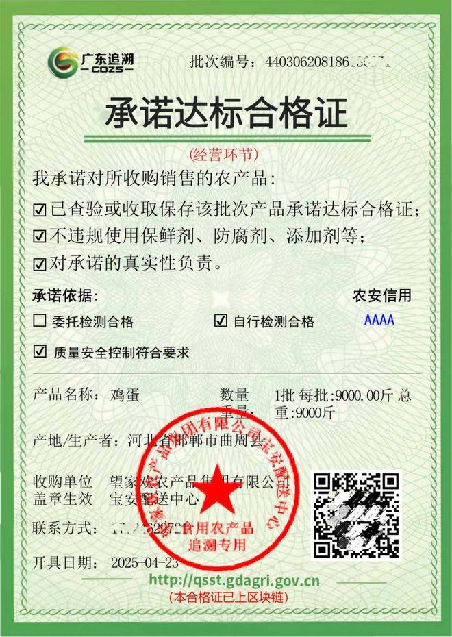 做为农产物畅通企业,《法子》激励采用消息化体例以提高效率。农产物方能入库。这是望家欢正在广东地域开具的许诺达标及格证。它不只要求“谁出产、谁担任”,及格证上必需包含这些要素: